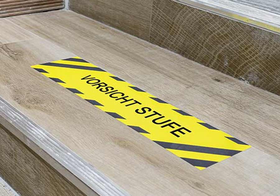 Alle Bodenaufkleber sind Rutschfest und haben die entsprechende Zertifizierung. Sie finden sie in den technischen Daten.